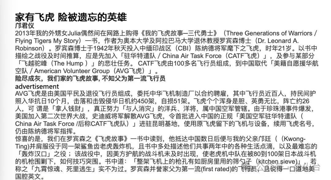 《家有飞虎 险被遗忘的英雄》是邝君仪为父亲写下的文章,更多人因此了解到邝廷的爱国热忱和英勇往事。